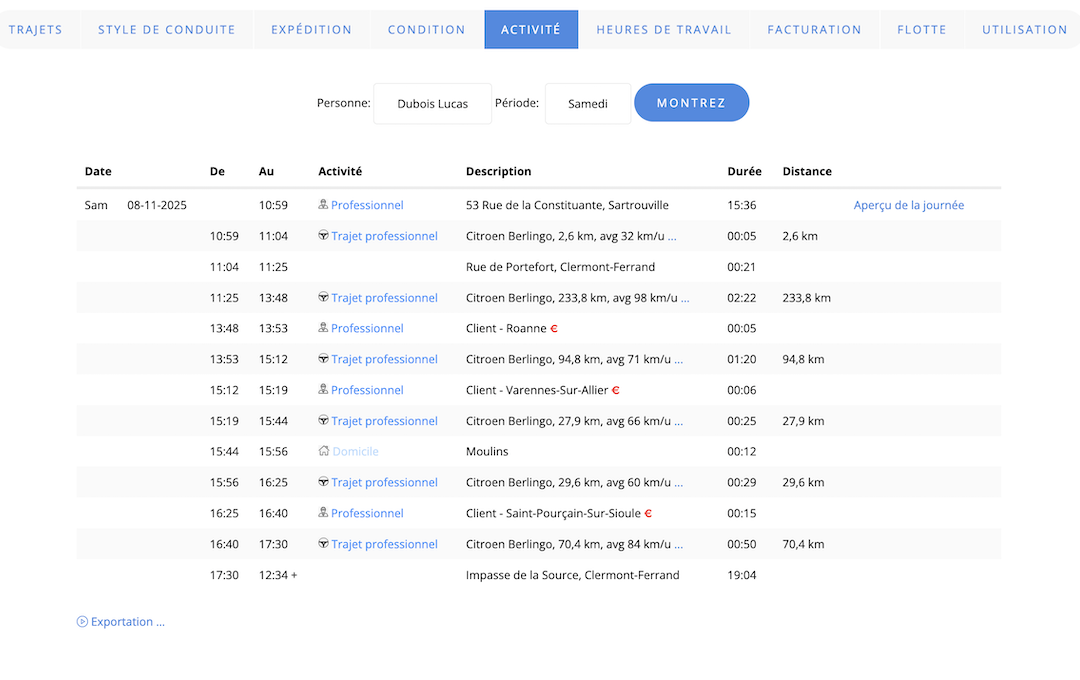 Le rapport d'activité donne un aperçu d'une journée complète pour une personne, y compris tous les déplacements, les arrêts, la marche au ralenti, les lieux, etc. Un outil utile pour contrôler le travail effectué par les employés mobiles et pour améliorer les données, le cas échéant, pour le rapport sur les heures de travail et l'indemnité de mobilité.